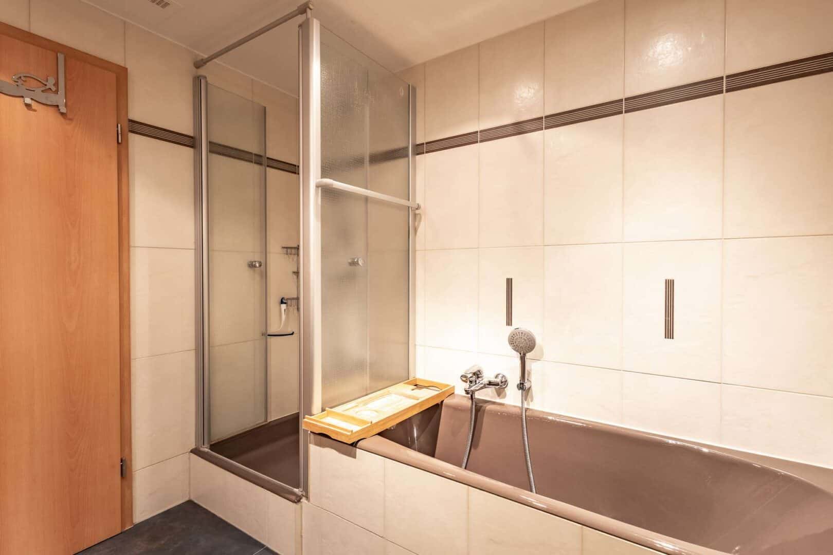 Das innenliegende Bad verfügt über eine Dusche, eine Wanne sowie zwei separate Waschbecken und bietet damit eine solide Grundlage für den täglichen Komfort. Ergänzt wird der Sanitärbereich praktischerweise durch ein separates WC.