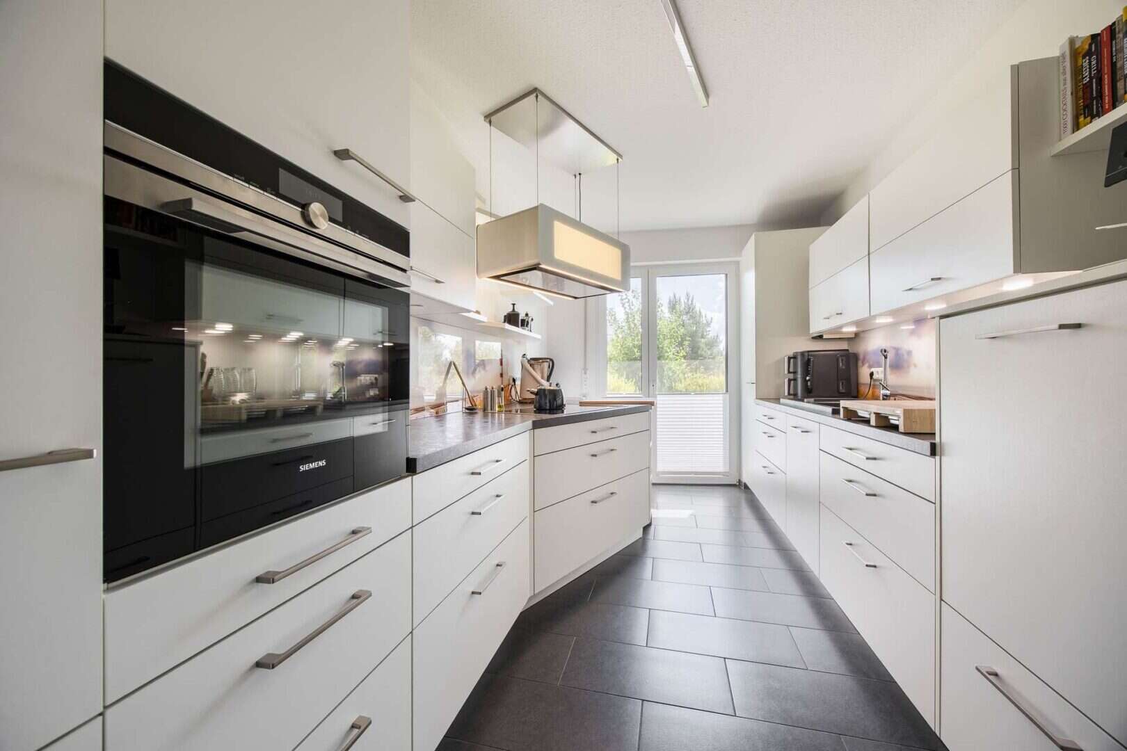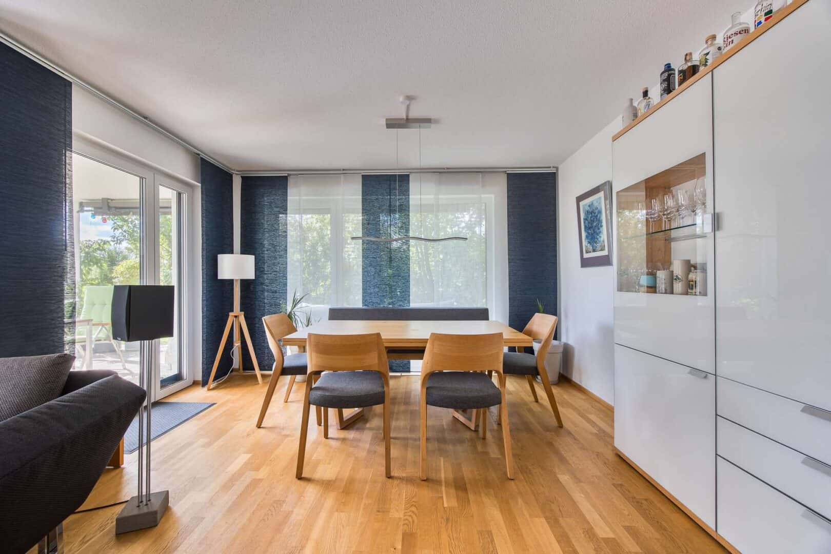 Der lichtdurchflutete Wohn- und Essbereich ist das Herzstück dieser Immobilie. Großzügige Fensterfronten mit zahlreichen bodentiefen Elementen schaffen Offenheit, Leichtigkeit und eine elegante Wohnatmosphäre. Von hier aus öffnet sich der Zugang auf die ca. 30 m² große Terrasse und in den rund 60 m² großen, bereits eingewachsenen Garten. Ein zweites Wohnzimmer im Grünen, das Privatsphäre garantiert und Platz für Entspannung, Spielen und gesellige Abende bietet. Die separate Küche ist klassisch abgetrennt und mit einer hochwertigen Einbauküche ausgestattet, die kulinarischen Ansprüchen auf höchstem Niveau gerecht wird.